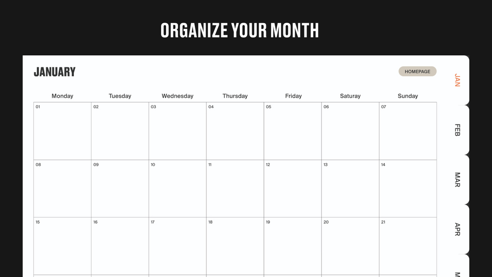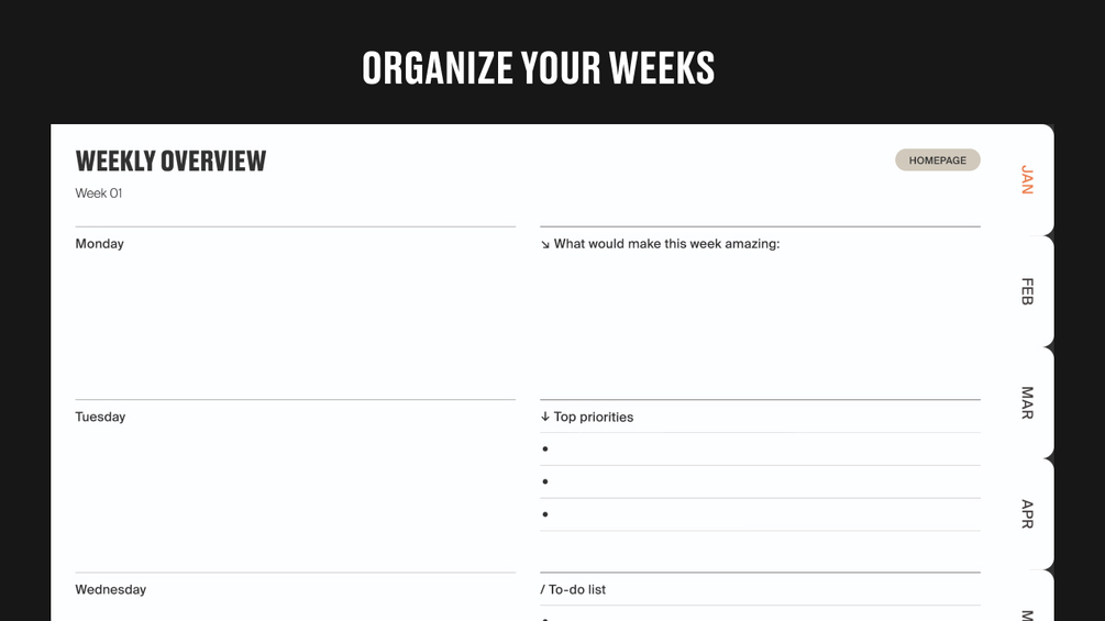 Set your ambitions for the year, break them down into monthly goals and plan your success week by week, day by day.